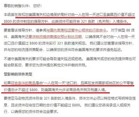 實際上,這一個通知主要是針對FBM自發貨的客戶,而且還是單人單日發貨總計貨值不超800美金的客戶。換一句更加好懂的話說就是,那便是:“一個賣家一天只能免稅貨值800美元,超出800美元,超出的產品進口的時候就要交關稅。”
