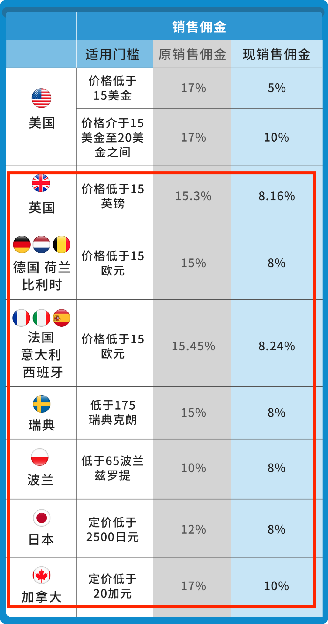 認(rèn)為這項(xiàng)政策只利好美國(guó)站的時(shí)候,亞馬遜全球開(kāi)店今天上午發(fā)文稱,不僅僅美國(guó)站,歐洲(英國(guó)、德國(guó)、荷蘭、比利時(shí)、法國(guó)、意大利、西班牙、瑞典、波蘭)、日本、加拿大都將會(huì)大幅下調(diào)低價(jià)服裝傭金,低到什么地步呢,低至三折起。