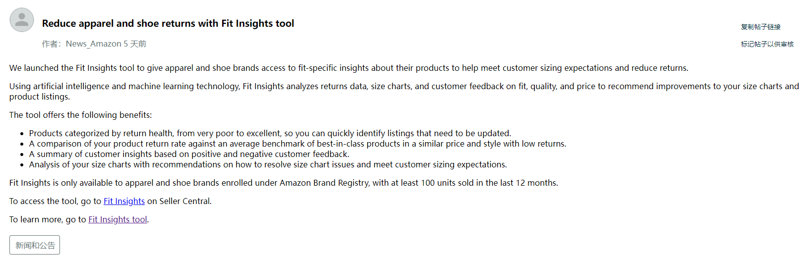 需要注意的是,F(xiàn)itInsights只適用于在亞馬遜品牌注冊(cè)的服裝和鞋類品牌,且過(guò)去12個(gè)月內(nèi)最少售出100件。
